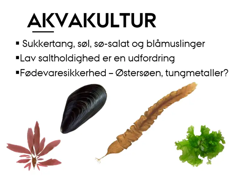 Når det gælder fødevareproduktion, viser målinger, at der er en stor naturlig tilvækst af blåmuslinger på stedet. Men tang og muslinger vokser langsomt i området på grund af den lave saltholdighed i Østersøen (under 10 promille). Det betyder også, at fjernelsen af næringsstoffer foreløbigt er lav. Spørgsmålet om fødevaresikkerhed er stadig under analyse.